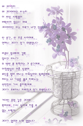왜 그대인지 왜 그대여야만 하는지 이 세상 사람들이 허락하지 않는다 해도 그대여야만 하는 이유가 내겐 있습니다. 한 순간, 한 호흡 사이에도 언제나 그대가 있기 때문입니다 허공의 옆구리에 걸린(--?) 잎사귀 하나가 수 백번 몸 뒤척이는 그 순간에도 아침햇살의 이른 방문에 부산을 떨며 떠나는 하루살이요!(--?) 뒷모습에도 저미는 내 가슴을 뚫고 자라나는 선인장의 가시 끝자락에도 그대가 우두커니 자리잡고 있기 때문입니다 거대한 운명 같은 그대여 죽어서도 다시 살아도 지울 수 없는 사람아 그대가 없으면 나도 없습니다. 있잔아.. 어디서 들은 말인데... 싱장은 주인앞에서만 두근거린데... 내 신장의 주인은 너인가봐. 내 심장은 너 앞에서만 두근거리거든.... 심장~~~!!!!!