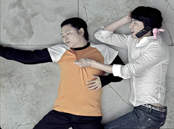 휴대전화를 들고 누워있는 조인성이 옆에 누워있는 남자에게 굴러가 "너 001이지?"라고 묻는다.