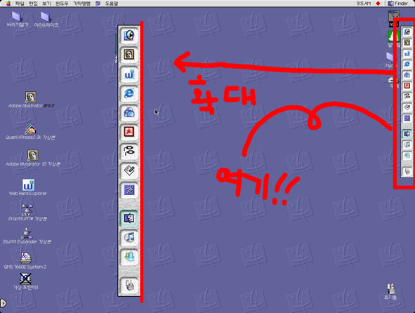 A-Dock이네요..너으실땐 쉬프트하고 집어너으심 됩니다/빼실땐 그냥 드래그로 휙 빼심 되구요/알트를 누르신채로 하단부분 클릭하면 메뉴창이뜹니다/옵션하고 클릭하면 잠김장치할수있구요/사과누르고 클릭하시면 손바닥모양생기면서 이동해서 원하는 위치에 노으시고/메뉴창이보고싶다하시면 조절판 > A-Dock control 가보세요