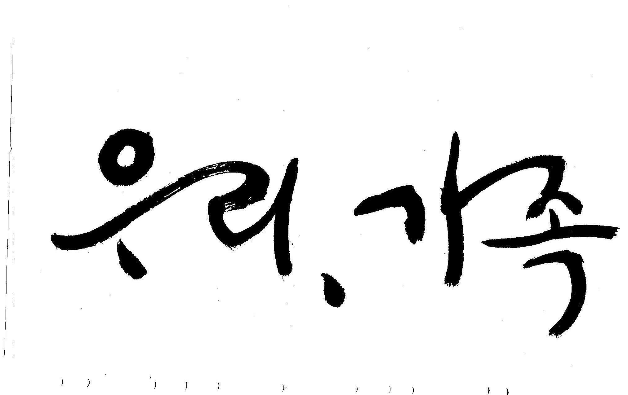 기축년 신년 으뜸말 휘호 김철호 일반 0 5312 2009.01.02 20:21 어떤 으뜸말이 올해엔 필요할까... 고민하다가.. 언제나 그랬듯이 어려울때에는 무엇보다도 우리라는 공동체의 가치관이 더 필요할것 같고 가족이라는 최소의 가치가 (여기서 최소라고 하는것은 가치를 말하는 것이 아니고 가장기본적인 단위를 말하는 것입니다.) 무엇보다도 앞서야 한다고 느꼈으므로 "우리"와 "가족"을 주제어로 정했습니다. 이것은 무조건 내 생각입니다. 다른분들은 다른 주제어가 있겠죠... 어쨌든지 ... 새해엔 행복하고 건강하세요..