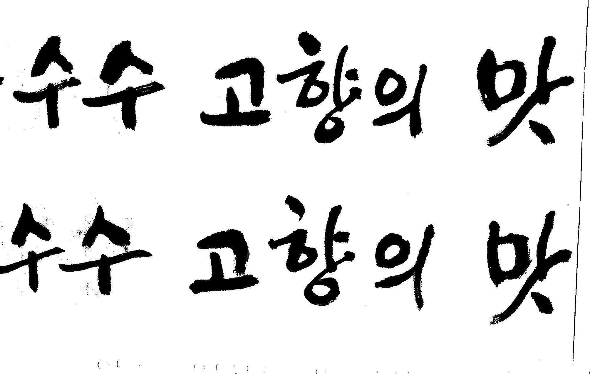 캘리고수님.. 캘리 부탁드립니다. 김철호 일반 1 13393 2008.10.31 15:45 > > > > > 강원도 > > 찰옥수수 > > 고향의 맛 > > > > 이상의 문구 입니다. > > 캘리 고수님들 시간되시면 도움 부탁드립니다.. > > > > 유용하게 쓰시길 , 스캔이 깨끗하지 못해서 수고 좀 하셔야 겠네요.. > "맛"이 라는 글자가 잘 않나와서 따로 올립니다. >