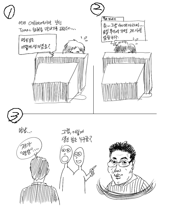ㅋㅋ 낮에 저보고 "누구세요"라는(게시판 "밤엔 이얼굴이 먹힌다") 말과 같은일을 당하셨나봐여... 아님 제 글을 보고 생각이 나서 그린건가요? ㅋㅋ