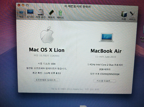 1.4GHZ, Intel Core2 Duo SL9400, 2GB DDR3, nVidia GeForce 320M, 11인치와이드, 128GB, ODD 미포함, USB x 2, 약 1.06kg, MAC OS X Snow Leopard, LED백라이트