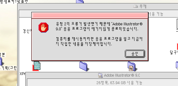 emoticon_096한글시스템의 프리퍼런스 폴더에서 어도비 일러스트 폴더를 찾아 그안의 파일을 모두 버리세요.