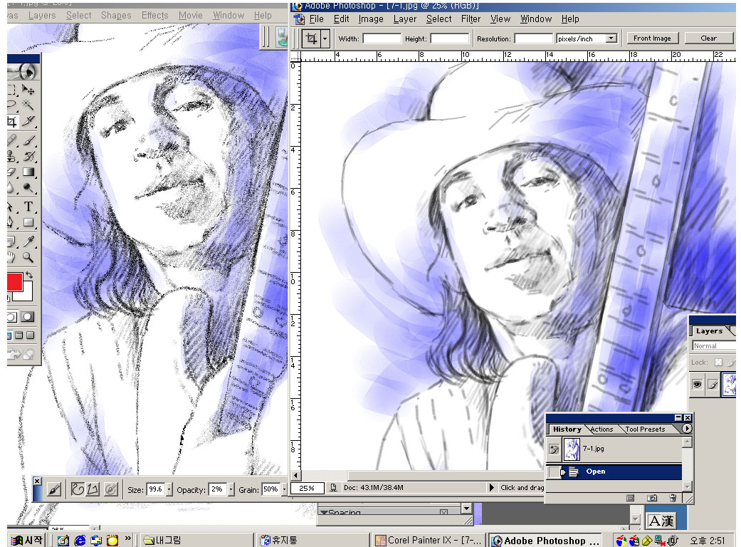 두 소프트웨어간에 색감이 다르다는 얘긴 들었지만 이건 머 한쪽은 엄청 거칠게 나오고 한쪽은 스무스하고